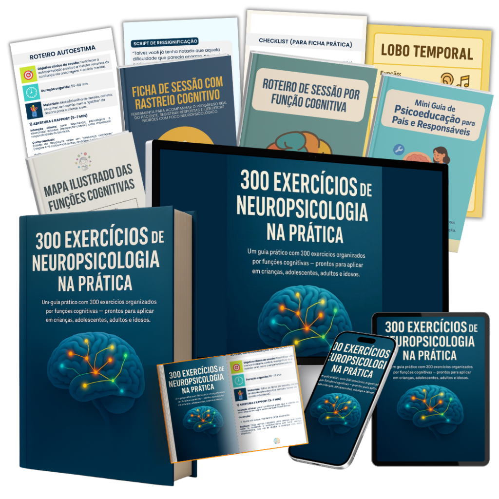 Você receberá um guia digital em PDF com 300 exercícios prontos, organizados por função cognitiva (atenção, memória, funções executivas, linguagem, visuoespaciais, velocidade de processamento e cognição social). Além disso, terá acesso a 4 bônus exclusivos que complementam e potencializam sua prática clínica.